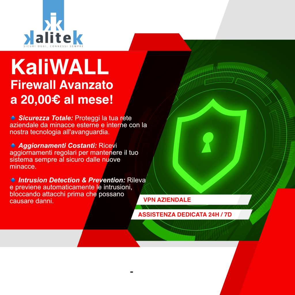 KaliWall è la soluzione di sicurezza completa offerta da Kalitek, progettata per proteggere le reti aziendali da minacce esterne e garantire una connessione internet affidabile e continua. Grazie alla sua tecnologia avanzata, KaliWall offre non solo protezione, ma anche ottimizzazione della connettività tramite aggregazione e backup.
